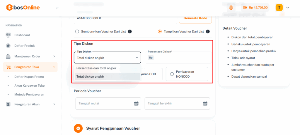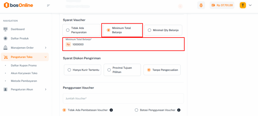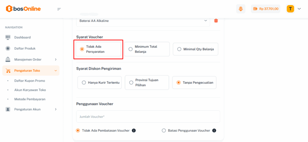 Jika sudah, kita akan lanjut pada bagian pengaturan syarat voucher. Dalam pengaturan ini, tersedia tiga kategori yang dapat dipilih: