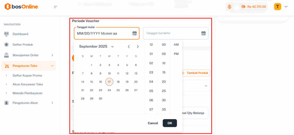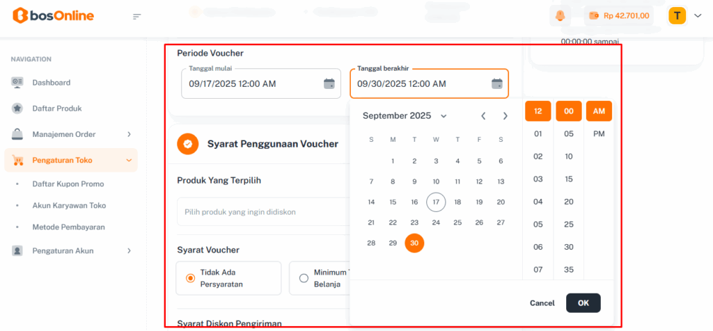 Selanjutnya, tentukan masa aktif voucher yang kamu buat. Pilih tanggal mulai dan tanggal berakhir serta jam penerbitan voucher sesuai kebutuhan.