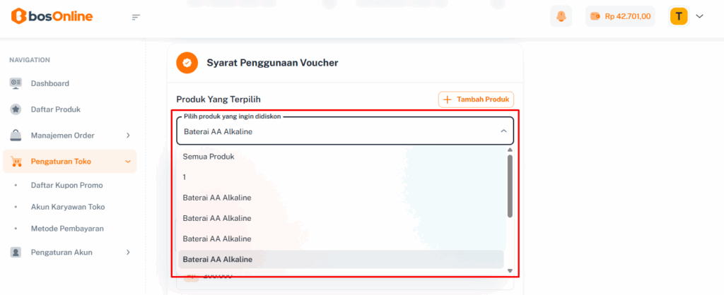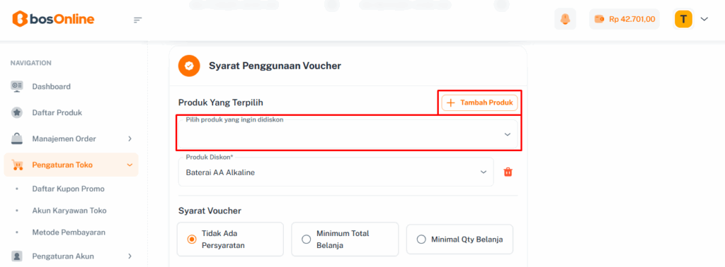 Jika memilih salah satu dari produk, kamu bisa menambahkan lebih dari 1 produk untuk diberi voucher dengan cara klik tambah produk.