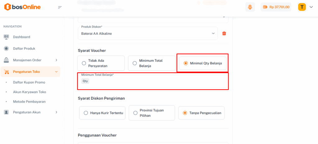 - Minimal Kuantitas Belanja: Voucher hanya berlaku apabila pengguna membeli produk dengan jumlah kuantitas minimal yang telah ditentukan