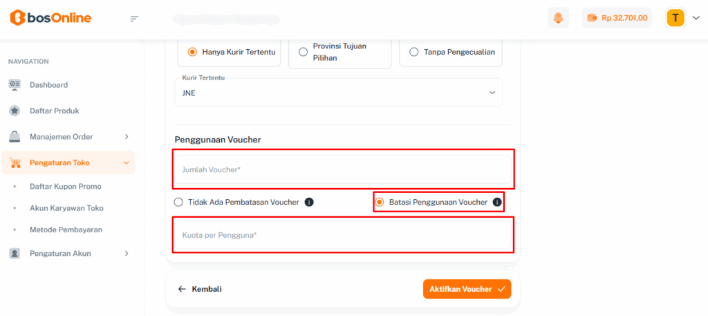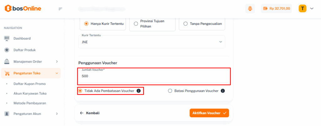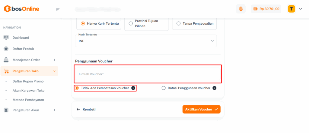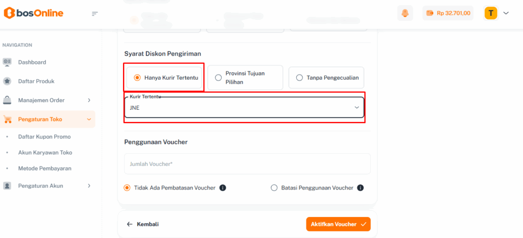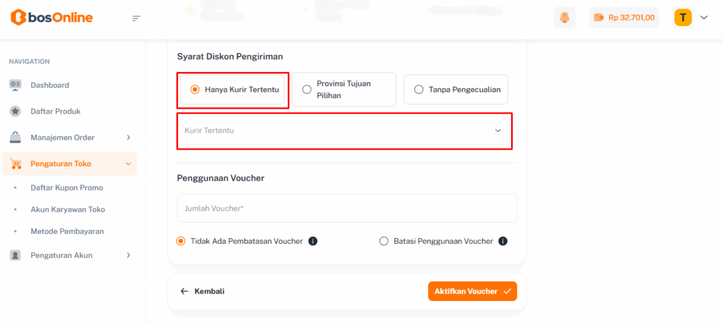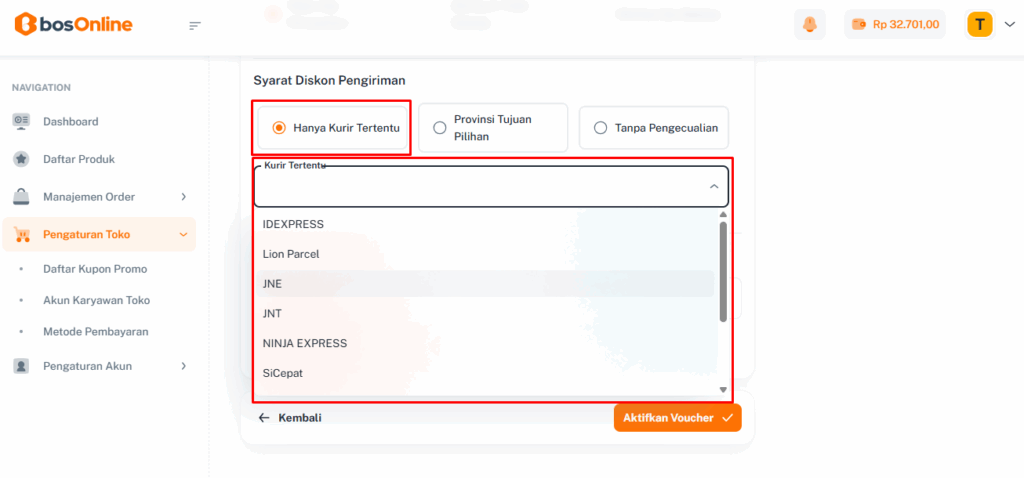 - Hanya Kurir Tertentu: Jika memilih kategori ini, kamu perlu menentukan kurir yang berhak mendapatkan diskon pengiriman.