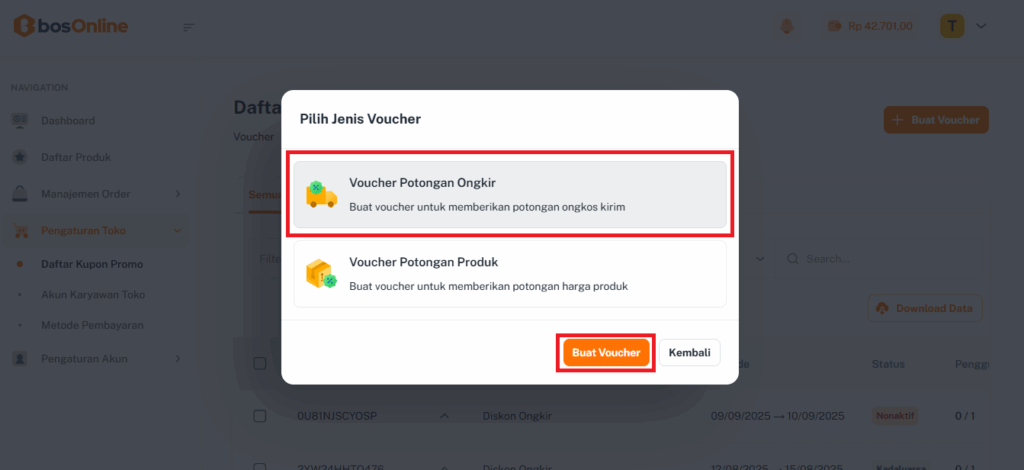 Setelah klik Buat Voucher, akan muncul pop-up berisi pilihan jenis voucher. Pada bagian ini, kamu dapat menentukan jenis voucher yang ingin dibuat: