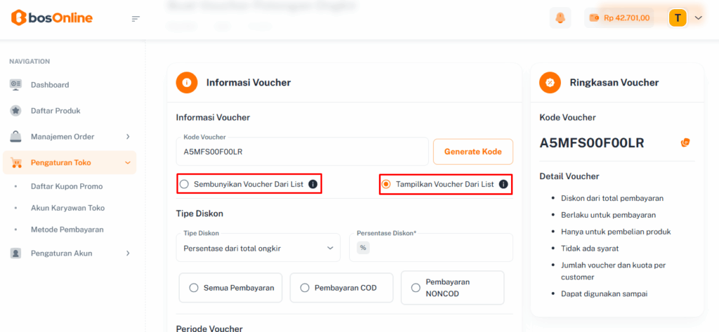 Selanjutnya, pilih apakah voucher akan ditampilkan atau disembunyikan dari list. Jika disembunyikan, voucher tidak akan muncul pada list. Jika ditampilkan, voucher akan terlihat di list.