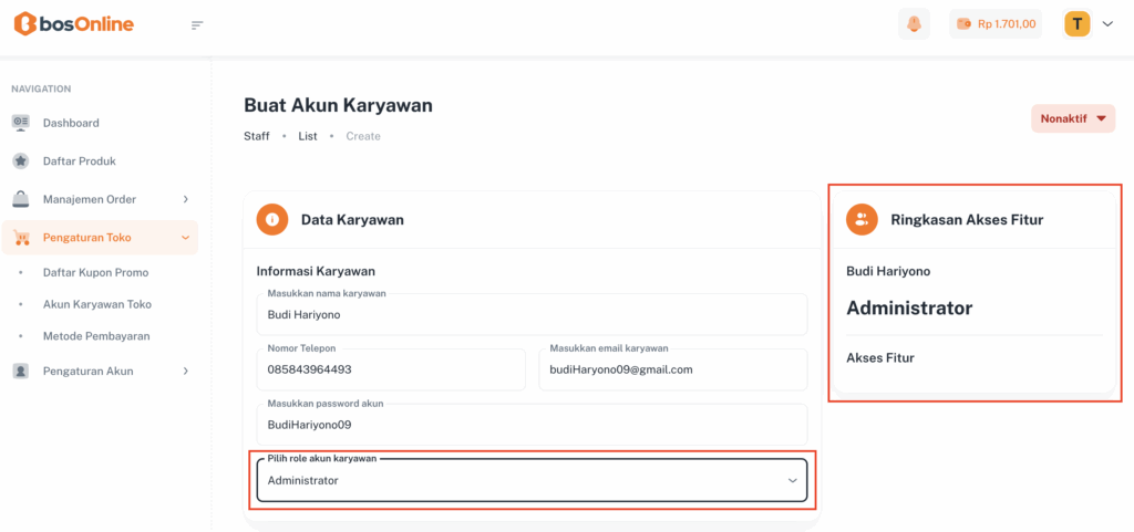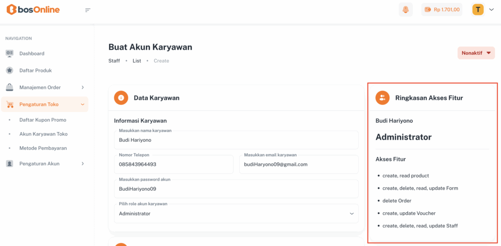Setelah akun karyawan berhasil ditambahkan, seluruh informasi beserta detail hak aksesnya akan dirangkum secara otomatis pada kolom Ringkasan Akses Fitur.
