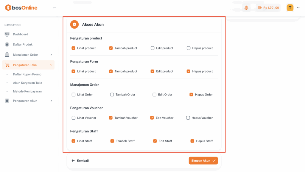 • Akses Akun: Bagian ini digunakan untuk menentukan role atau hak akses yang dapat digunakan oleh karyawan.