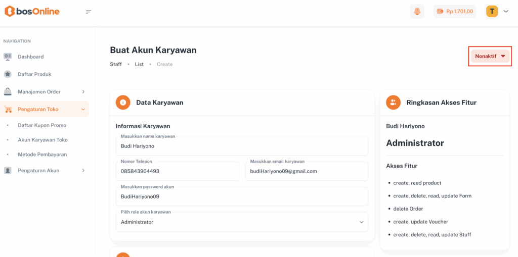 Perhatikan tombol Nonaktif di pojok kanan atas. Tombol ini berfungsi untuk mengatur status akun karyawan.