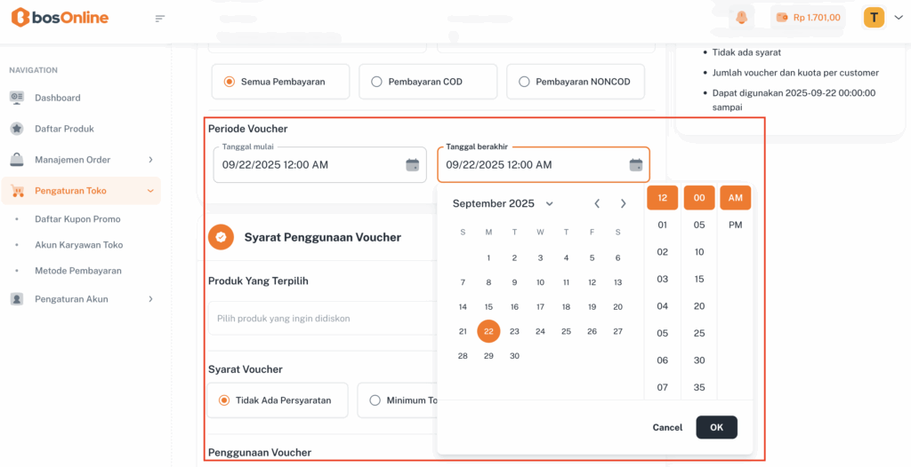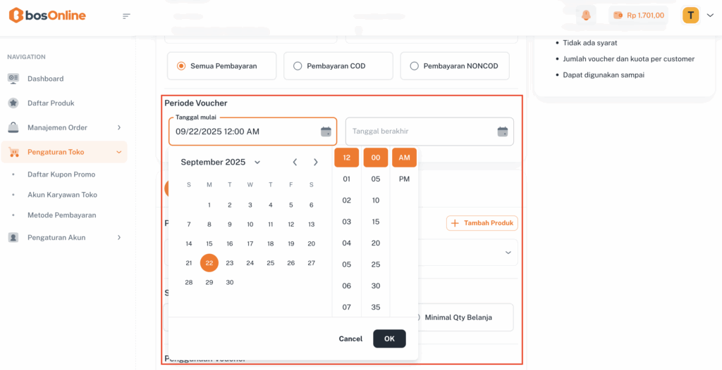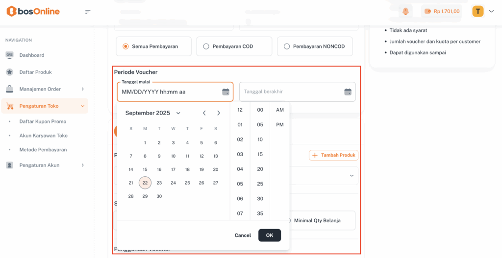 - Tanggal Mulai: Tanggal ini menandai kapan voucher mulai aktif dan dapat digunakan oleh pelanggan.Voucher hanya bisa digunakan setelah melewati tanggal dan jam mulai yang ditentukan. Contoh : Jika Anda memilih 1 Oktober 2025 pukul 09:00, maka voucher akan otomatis aktif pada tanggal dan jam tersebut.