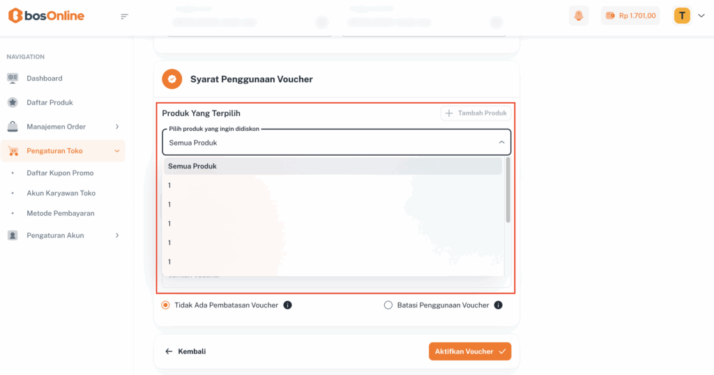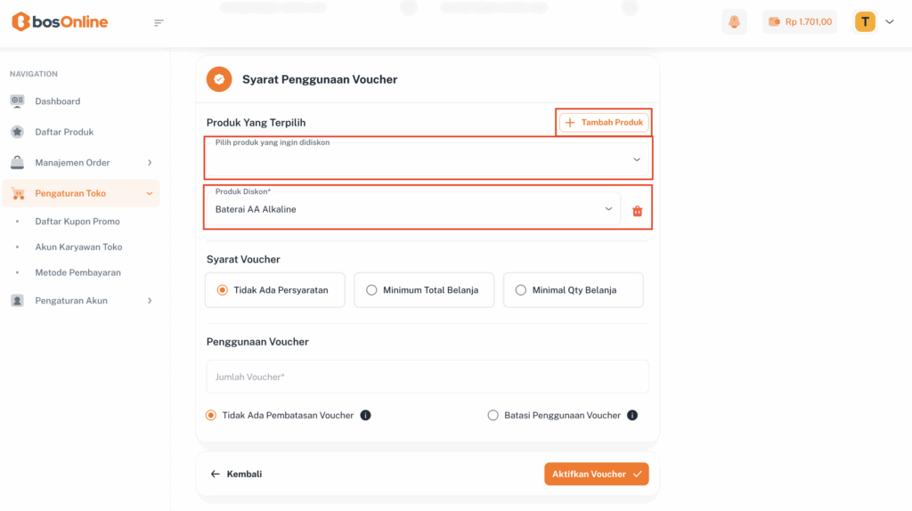 Jika memilih salah satu dari produk, kamu bisa menambahkan lebih dari 1 produk untuk diberi voucher dengan cara klik tambah produk.