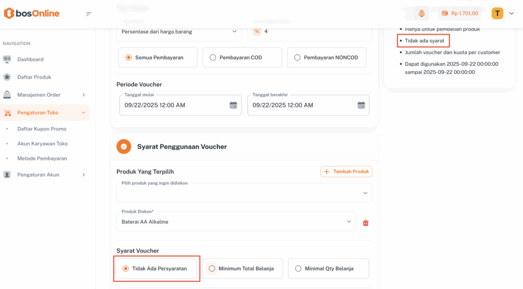 Jika sudah, kita akan lanjut pada bagian pengaturan syarat voucher. Dalam pengaturan ini, tersedia tiga kategori yang dapat dipilih :