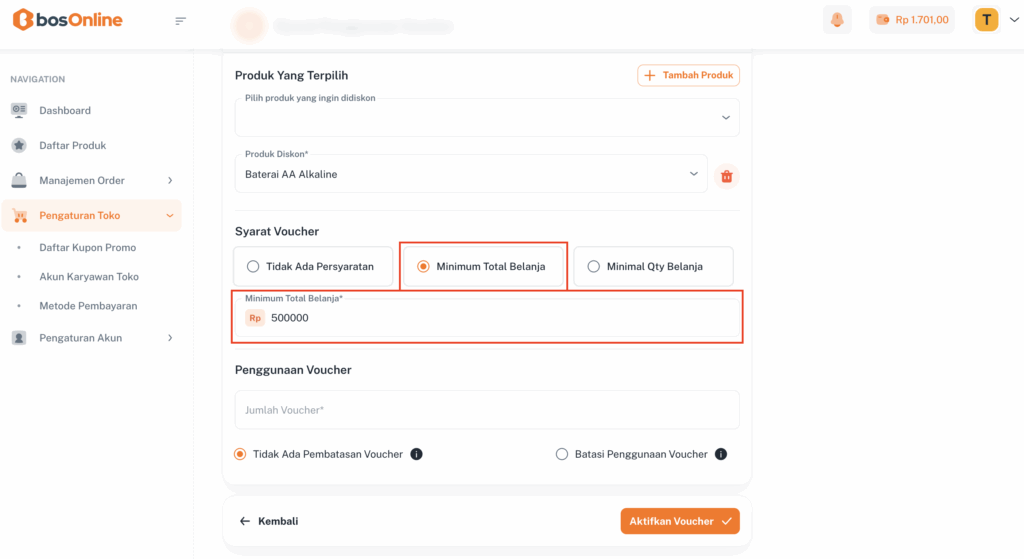 - Minimal Total Belanja: Voucher hanya berlaku apabila pengguna mencapai jumlah total belanja tertentu.