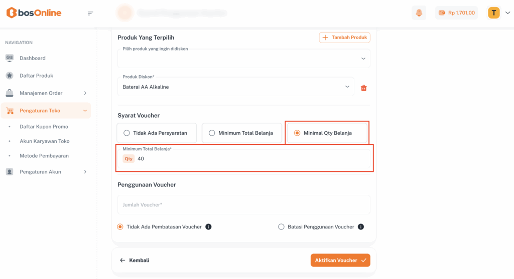 - Minimal Kuantitas Belanja: Voucher hanya berlaku apabila pengguna membeli produk dengan jumlah kuantitas minimal yang telah ditentukan
