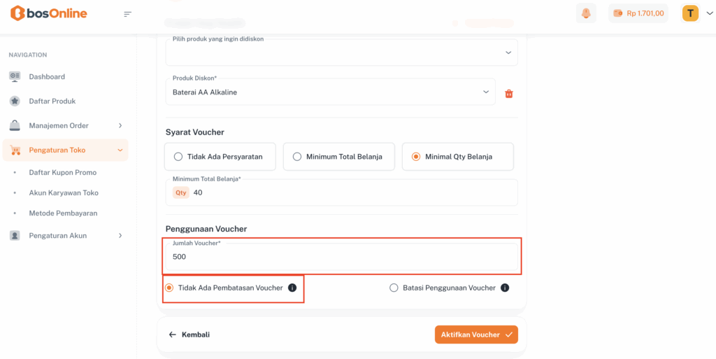 - Tanpa pembatasan voucher: Jika memilih opsi ini, voucher yang kamu buat dapat digunakan tanpa batasan jumlah penggunaan.