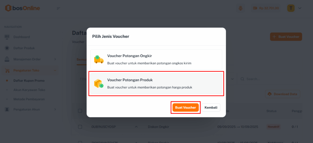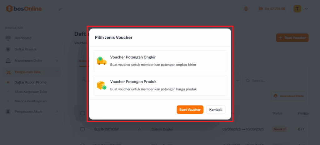 Setelah klik Buat Voucher, akan muncul pop-up berisi pilihan jenis voucher. Pada bagian ini, kamu dapat menentukan jenis voucher yang ingin dibuat: