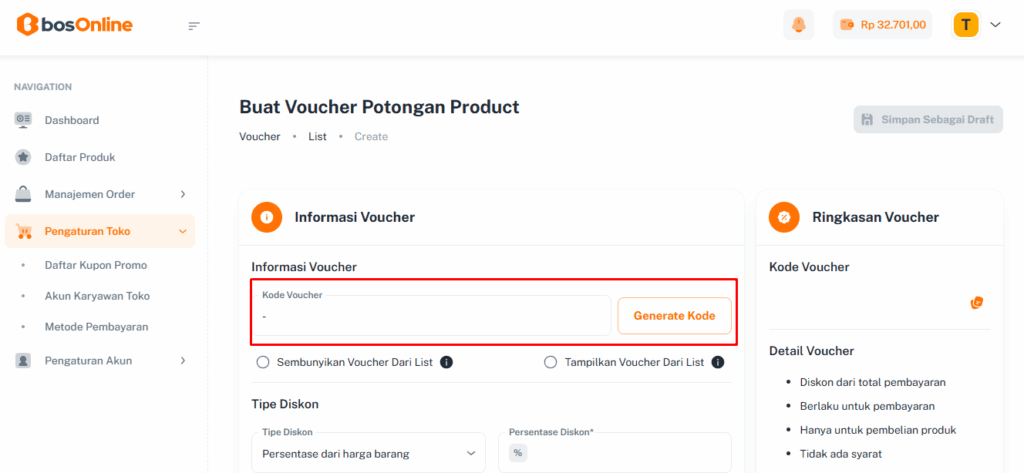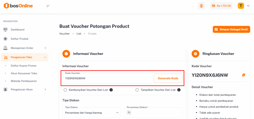 Sebelum membuat voucher, perhatikan informasi penting berikut. Kode voucher akan dihasilkan secara otomatis oleh sistem dan tidak dapat diubah secara manual. Tekan tombol Generate untuk mendapatkan kode voucher.