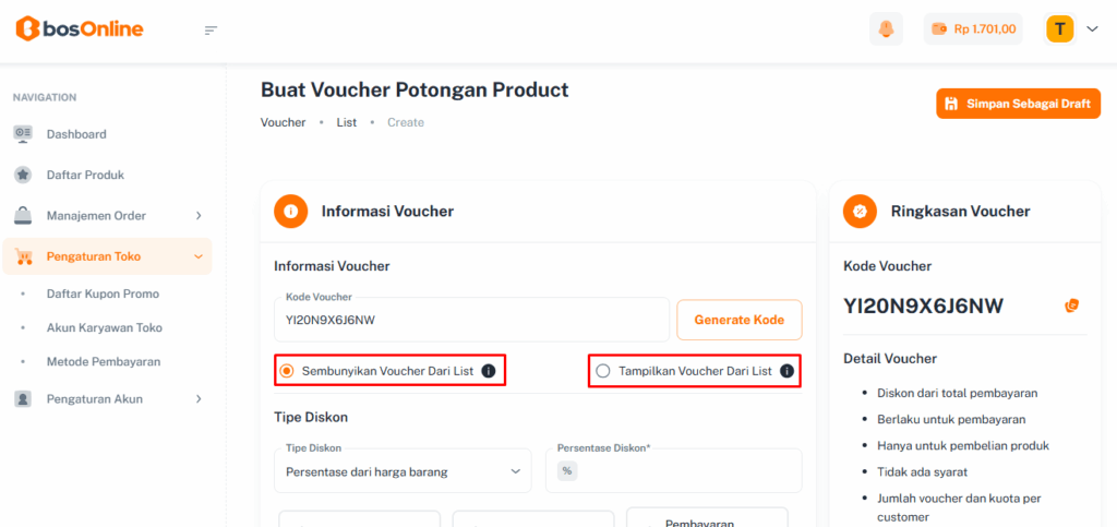 Selanjutnya, pilih apakah voucher akan ditampilkan atau disembunyikan dari list. Jika disembunyikan, voucher tidak akan muncul pada list. Jika ditampilkan, voucher akan terlihat di list.