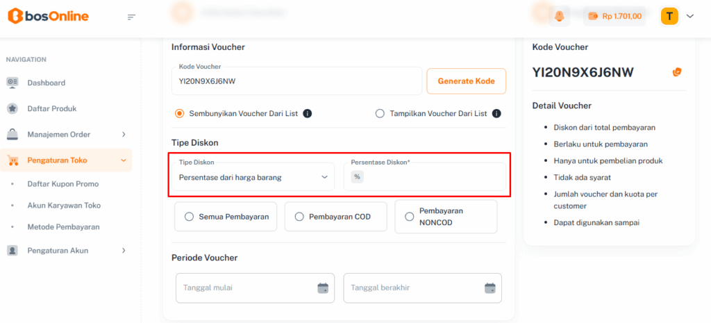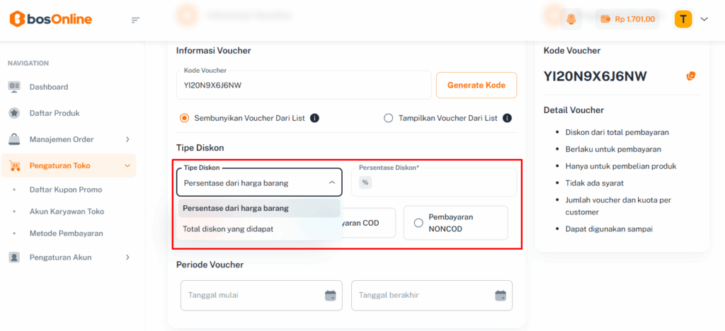 Lalu, kamu dapat memilih tipe diskon dan mengisi nilainya sesuai kategori yang tersedia. Terdapat dua kategori yang dapat dipilih