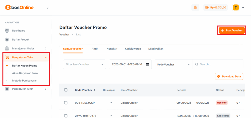 Langkah pertama, buka menu Pengaturan Toko, lalu pilih opsi Daftar Kupon Promo. Setelah masuk ke halaman Daftar Voucher Promo, klik tombol Buat Voucher untuk mulai membuat voucher baru.