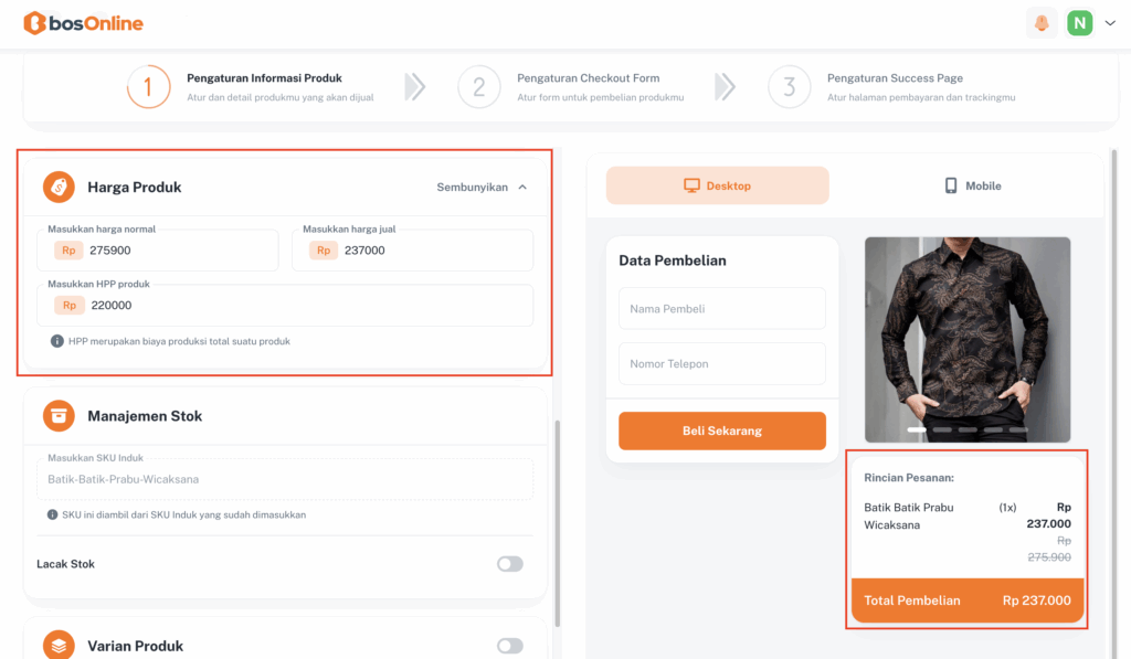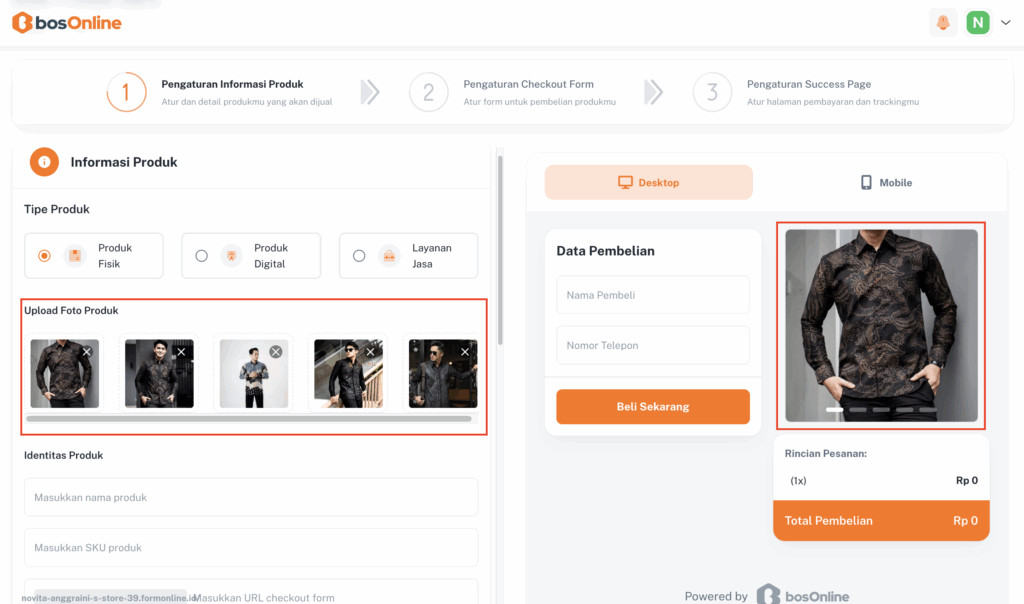 Masukkan detail produk seperti nama, harga, kategori, dan deskripsi agar pelanggan lebih mudah mengenali produkmu. - Pengaturan Checkout Form