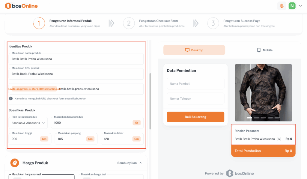 Selanjutnya, masuk ke bagian Harga Produk.