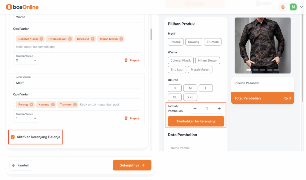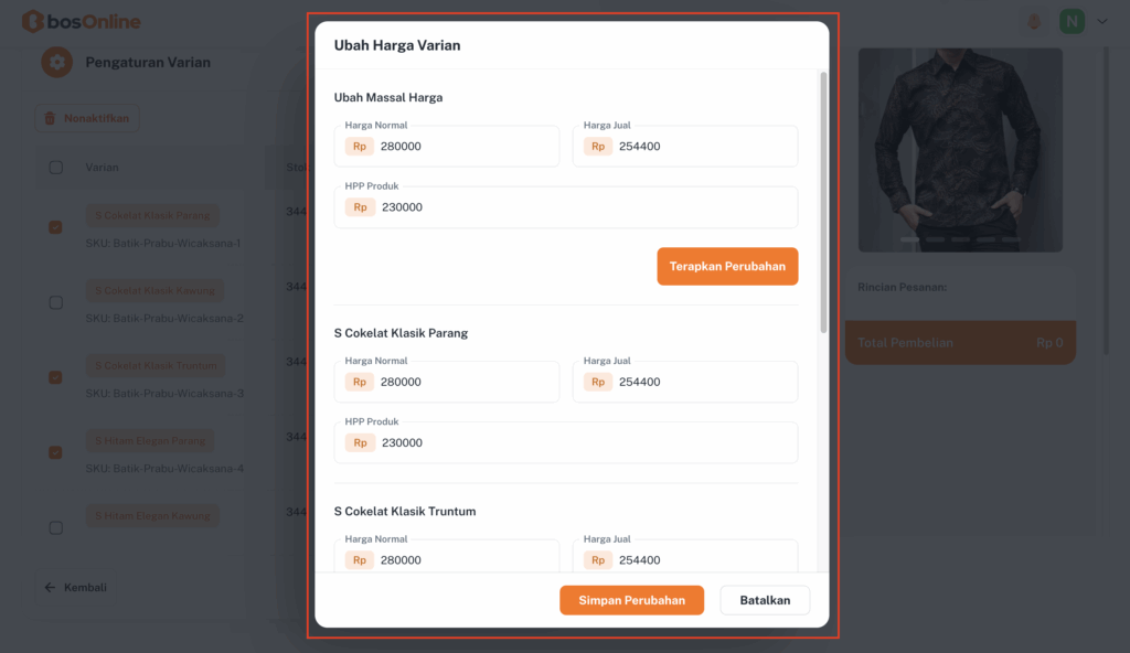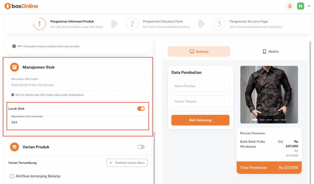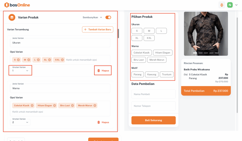 Kalau produkmu memiliki beberapa varian, jangan khawatir di bosOnline, kamu bisa menambahkan berbagai varian dengan mudah.