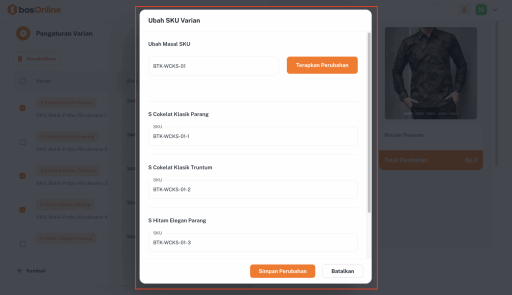 Untuk mulai mengubah, cukup isi field SKU baru, lalu klik “Terapkan Perubahan”. Setelah itu, sistem akan mengupdate SKU secara otomatis pada semua varian yang kamu pilih.