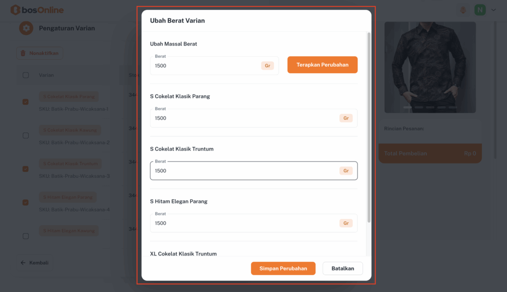 Klik “Ubah Berat”, maka akan muncul pop-up Perubahan Berat Varian yang menampilkan daftar varian yang sudah kamu pilih sebelumnya.