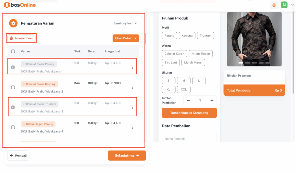 Jika kamu mengklik Aktifkan/Nonaktifkan Varian, maka satuan varian yang kamu pilih akan otomatis ikut aktif atau nonaktif.