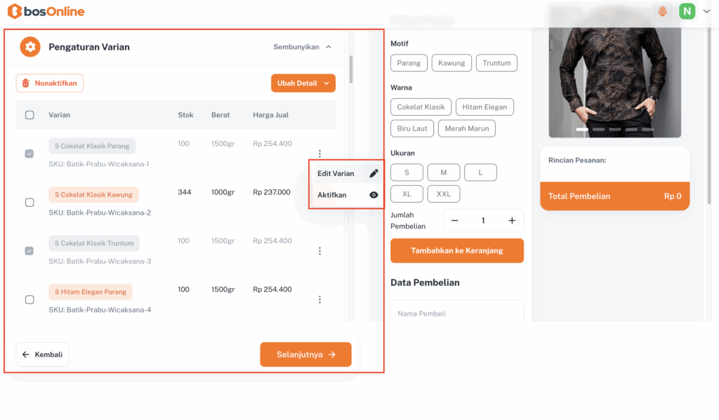 Gunakan varian agar pembeli bisa memilih produk dengan lebih fleksibel misalnya berdasarkan ukuran, warna, atau motif batik.