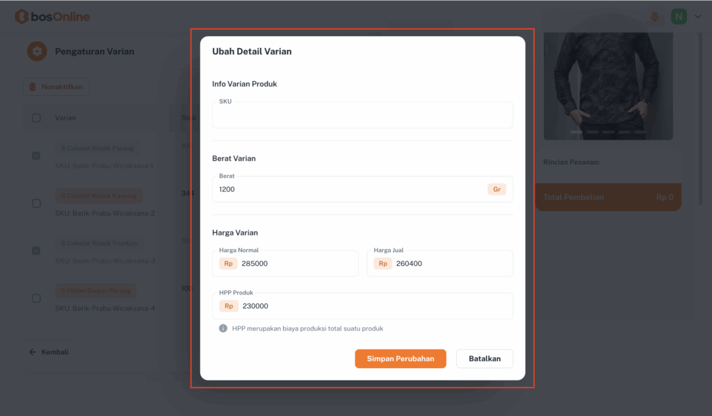 Jika kamu memilih Edit, akan muncul pop-up Ubah Varian yang berisi informasi varian produk, berat varian, dan harga varian untuk satu produk.