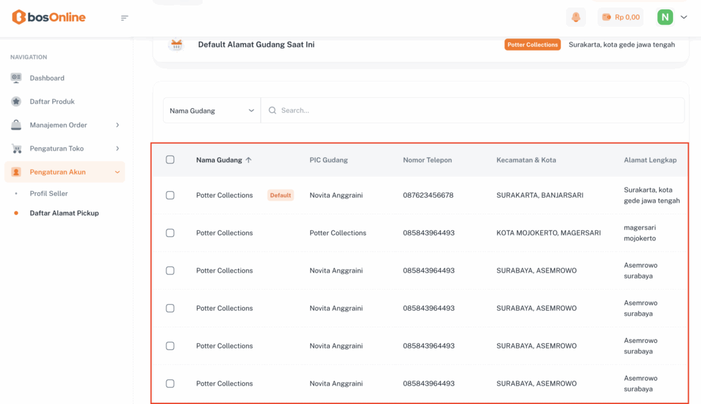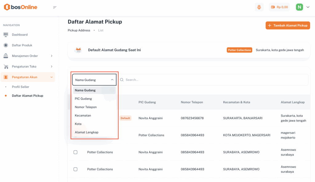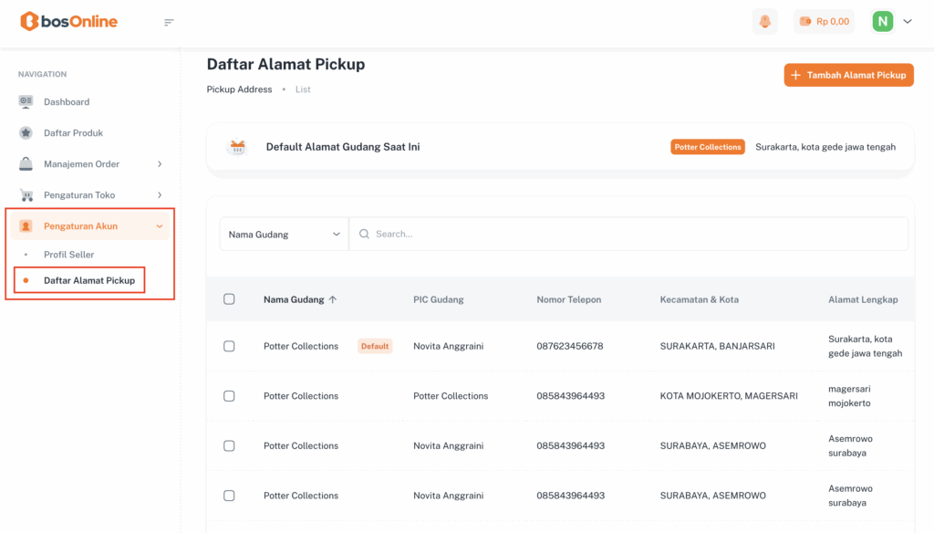 Ingin melihat semua alamat pickup yang sudah kamu tambahkan, termasuk alamat gudang yang sedang kamu gunakan?
