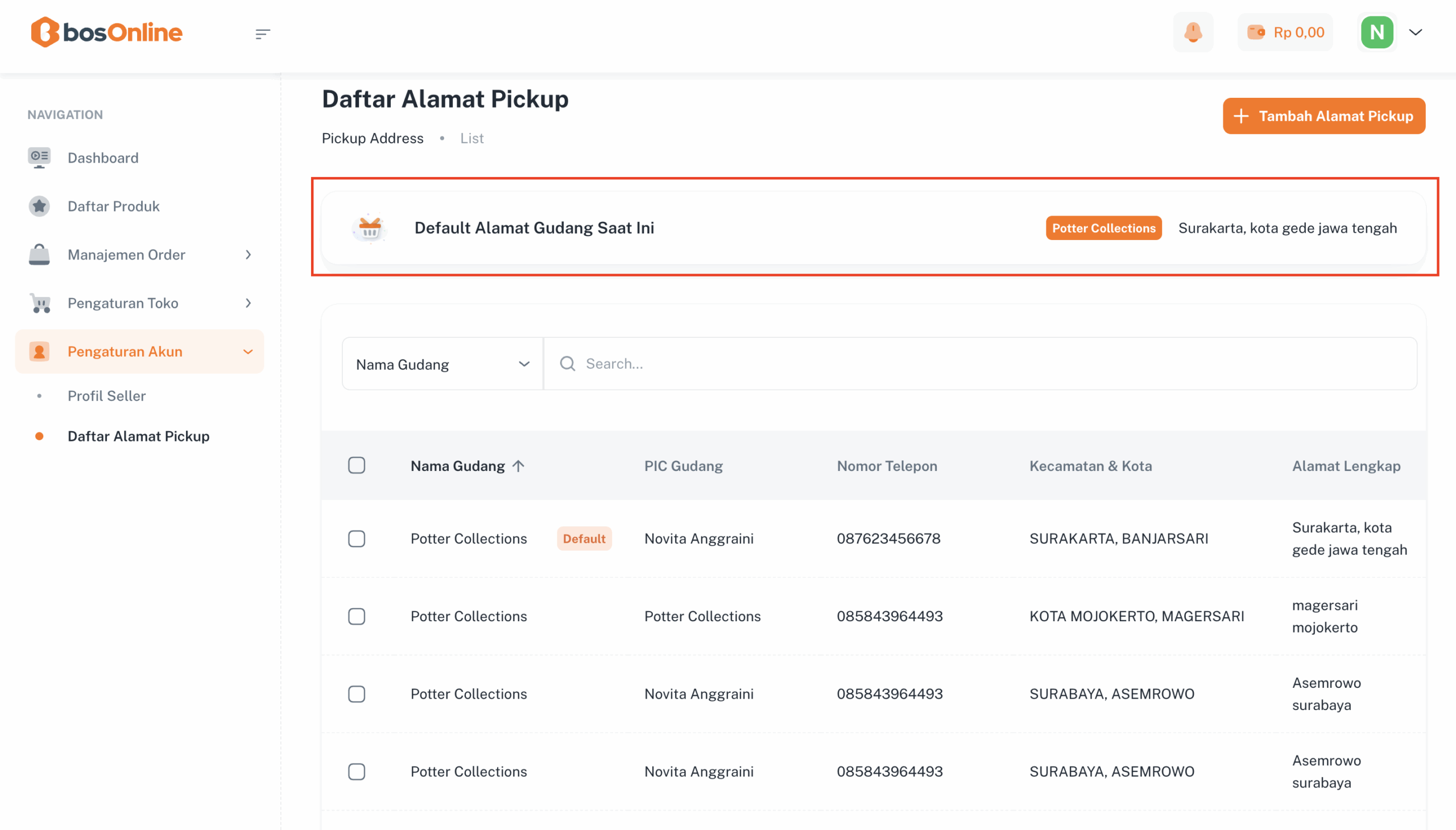 Jika kamu ingin menggunakan gudang lain sebagai alamat utama, kamu bisa mengubah pengaturannya melalui halaman Daftar Alamat Pickup, lalu menetapkan gudang pilihanmu sebagai Default.