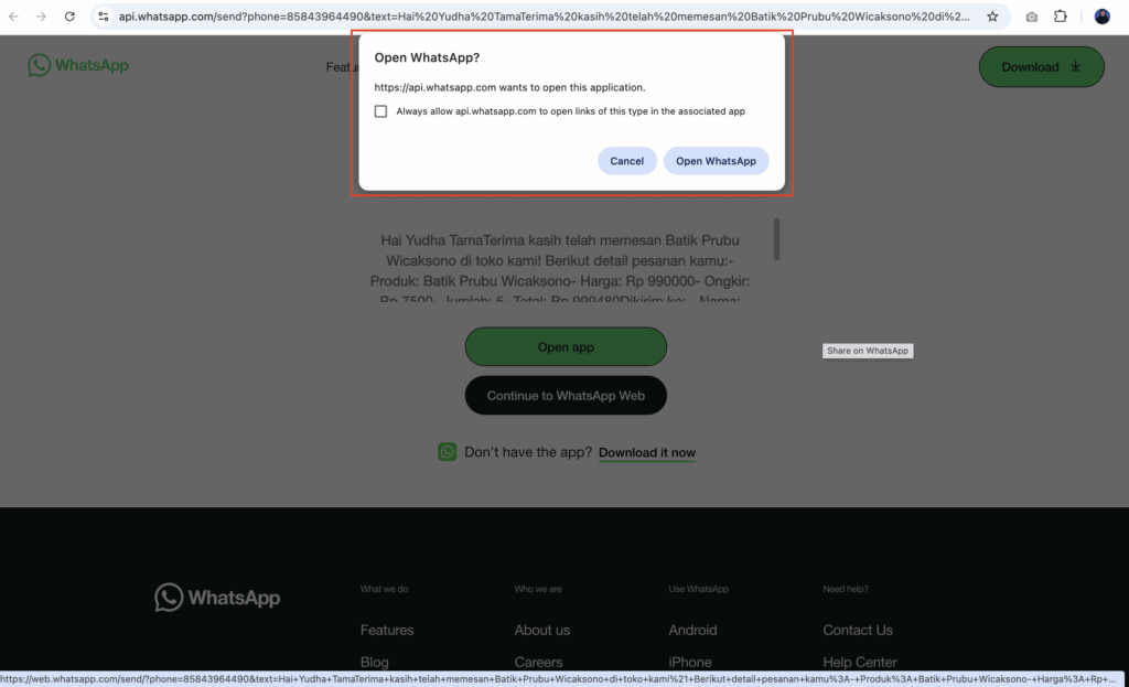 Jika teks follow up-nya dirasa sudah sesuai, kamu bisa langsung klik Kirim Pesan. Setelah kamu klik kirim pesan, maka akan diarahkan ke whatsapp